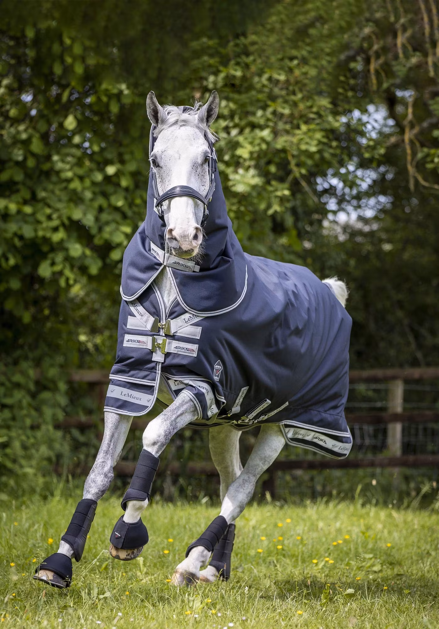 Reflekterande säkerhetsremsor. En rejäl silikonklädd, avtagbar svansrem tillsammans med extra långt svansskydd. Täcket levereras komplett med en löstagbar hals och är kompatibel med hela utbudet av LeMieux täckesliners, bogskydd och halsar, vilket ger dig full flexibilitet över säsongerna.