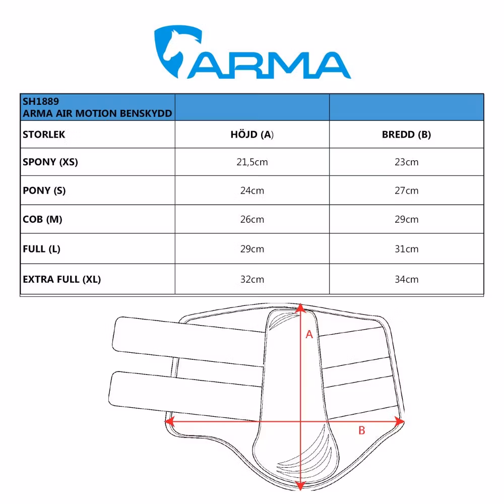 Lätta och ventilerande benskydd med en öppen och luftig struktur som nästan ger en viktlös känsla. Perfekt för varma träningspass, träning eller tävling. Det 3D-meshade materialet främjar luftflöde när hästen rör sig, vilket håller benen svala och torra. Stötdämpande och kompressionsresistent support skyddar mot slag och stötar. ARMA stötresistenta strykkappor skyddar insidan av benet mot skador. Tidigare kallar ARMA Air Motion Benskydd.