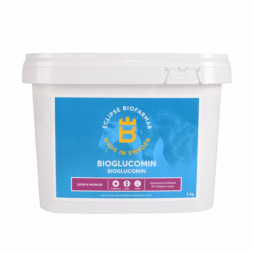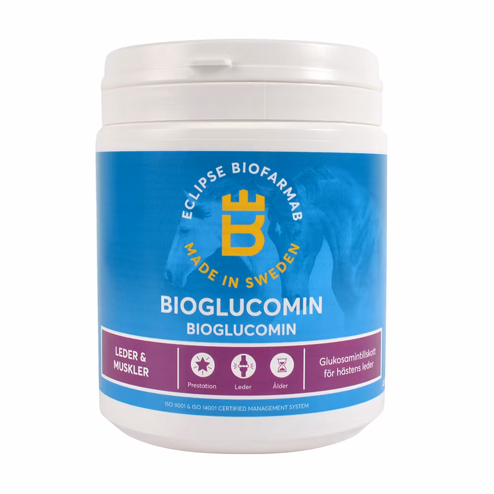 BioGlucomin innehåller högkoncentrerad glukosamin med extra hög upptagningsförmåga. Innehåller även mangan och metionin. Idealisk för presterande samt äldre hästar. Vid ökad påfrestning och stigande ålder minskar kroppens förmåga att nybilda viktiga ämnen.