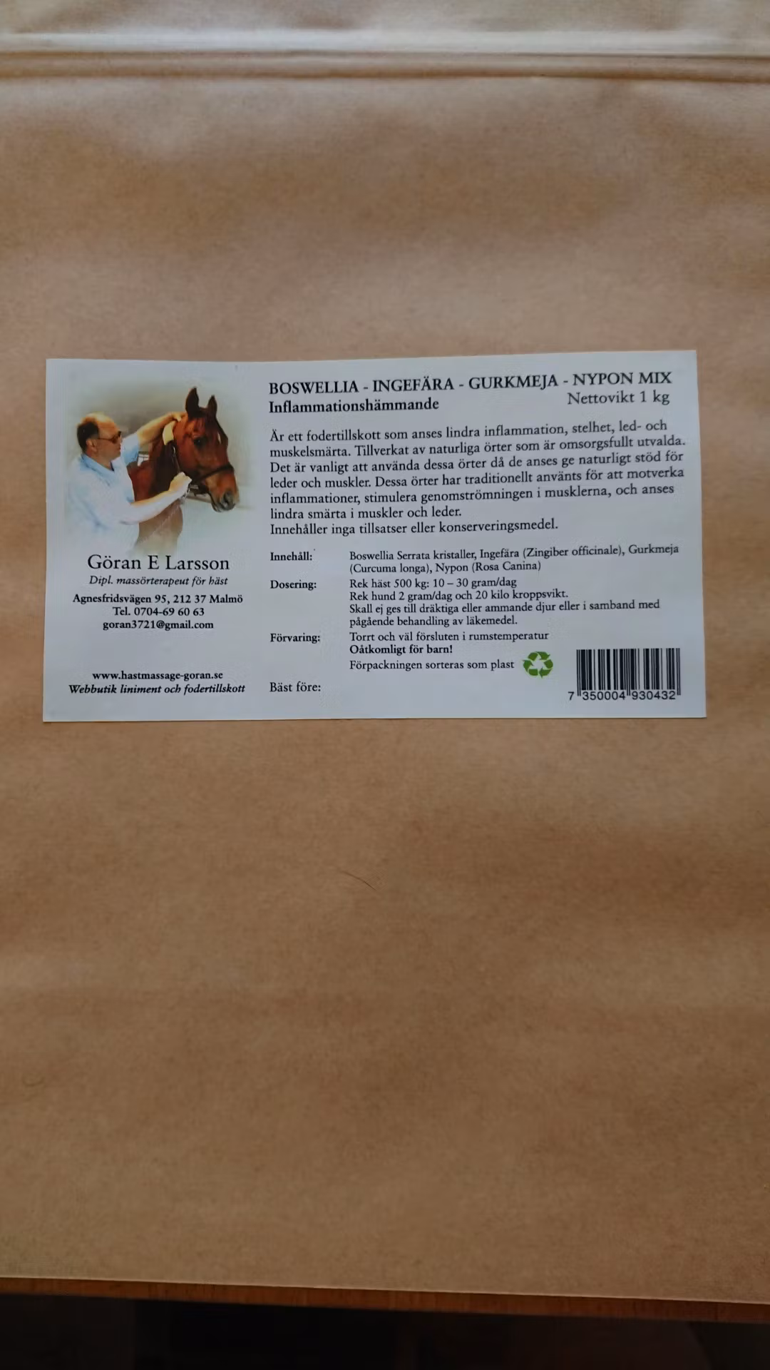 Fodertillskott som anses lindra inflammation, stelhet, led- och muskelsmärta. Tillverkat av naturliga örter som är omsorgsfullt utvalda vilka anses ge naturligt