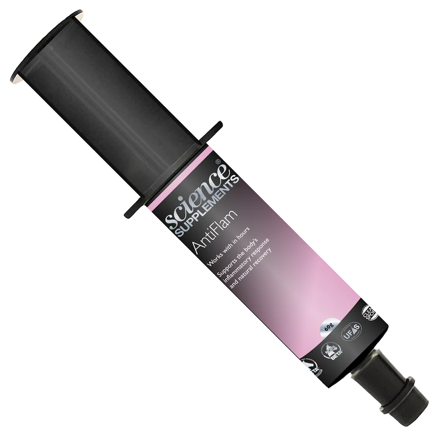 Finns i en lättadministrerad spruta som kan användas både före eller efter träning och motion. AntiFlam har genomgått 2 års forskning och utveckling, inklusive försök på 90 tävlingshästar.