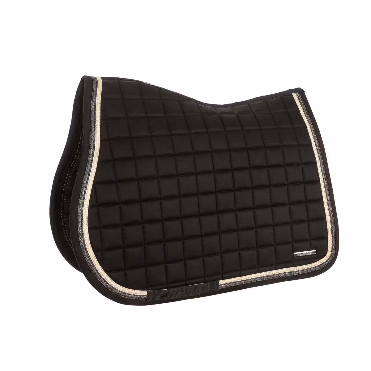 Schabrak i tålig bomullstwill med två dekorativa glitterband. Insida i 3D-vävd Air-flow Quick Dry, ett material med cooling effekt och som genom sin luftiga struktur hjälper till att hålla hästen torr. Schabraket har en stadig padding bestående av 240 gr Synthermax vadd + 8 mm foam. Synthermax fiberfill ger en garanterat hög andningsförmåga och god komfort. Synthermax framställs utan bindande lim, vilket ger en lätt och luftig vadd som behåller sitt utseende även efter upprepade tvättar. Sadelgjordsstrap med kardborre. Dekorativ Lami-cell metall badge på vänster sida av schabraket och Lami-cell brodyr på manken. Tvätt 30 grader. Storlek Full.