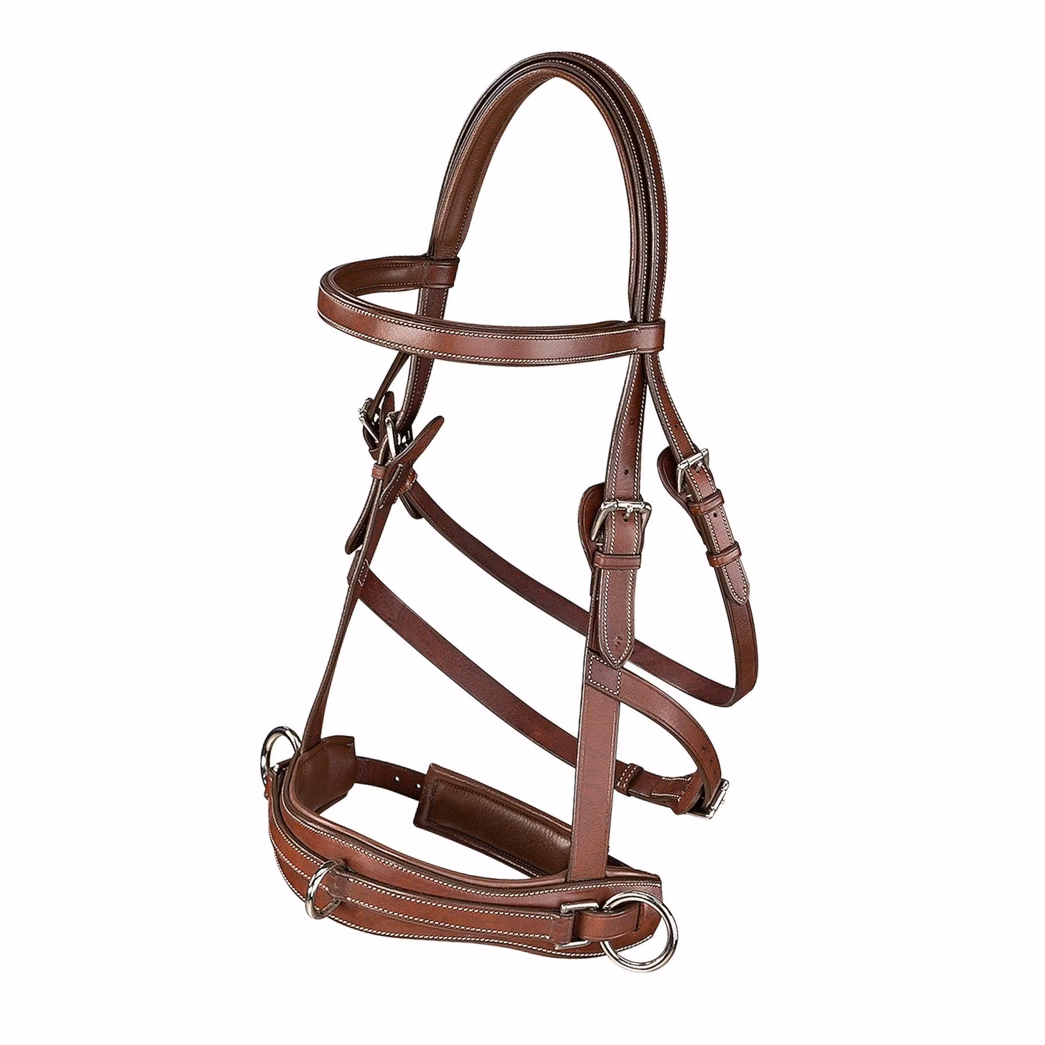 Tillverkad i vegetabiliskt garvat amerikanskt läder. Fodrad nos, nacke och pannband. Nosgrimma med två ringar på sidan och D-ring på mitten, nosgrimman är utan