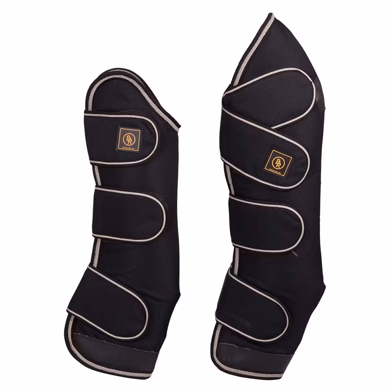 Denna höga modell av transportskydd är anatomiskt formad och skyddar benet från knä eller has till hov. De breda kardborrebanden gör att du snabbt kan ta på och av. Bakskydden har två kardborreband med resår upptill som går tvärs över varandra. Detta gör det enklare att fästa dem och de säkerställer att skydden sitter på plats. Säljs i 4-pack
