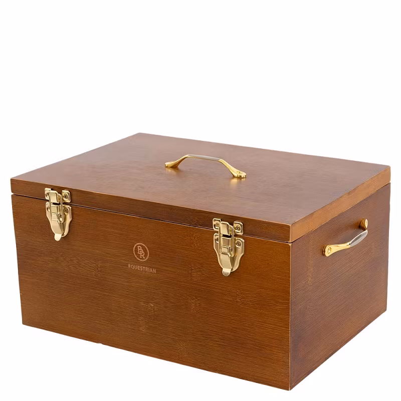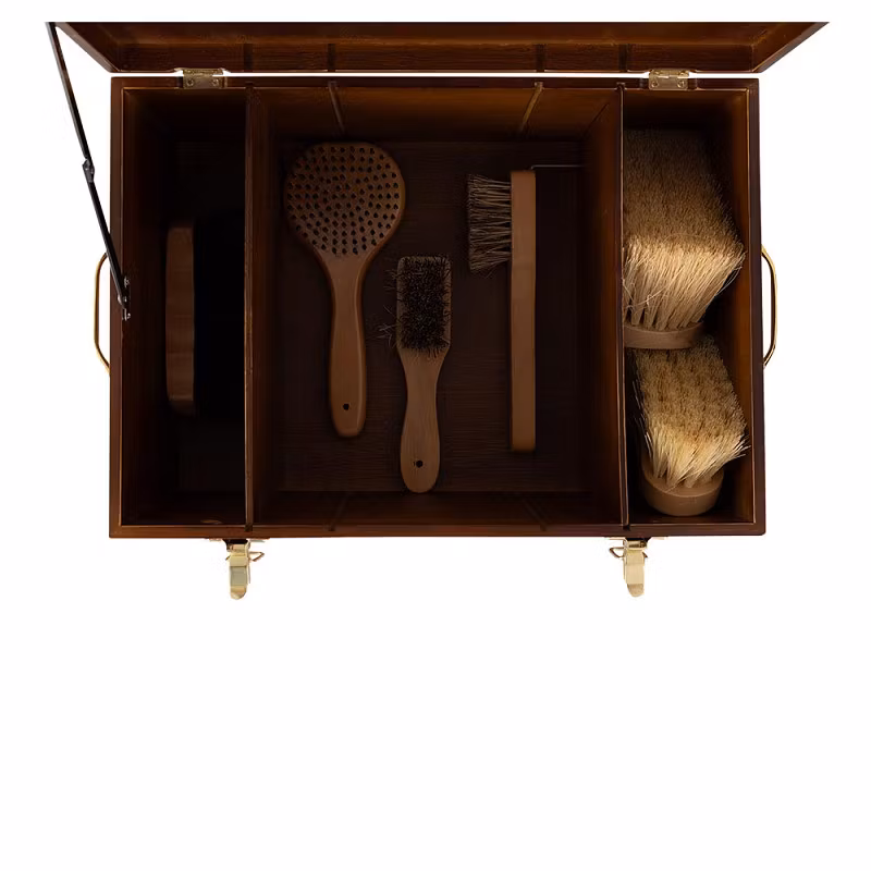 Denna lyxiga skötlåda är gjord av bambuplywood, som är ett miljövänligt alternativ till träplywood. Boxen är robust och håller länge. Groomingboxen är lackad med ett vegetabiliskt lack och har en bivaxfinish för en vacker glans. Förslutningarna är gjorda av mässing.