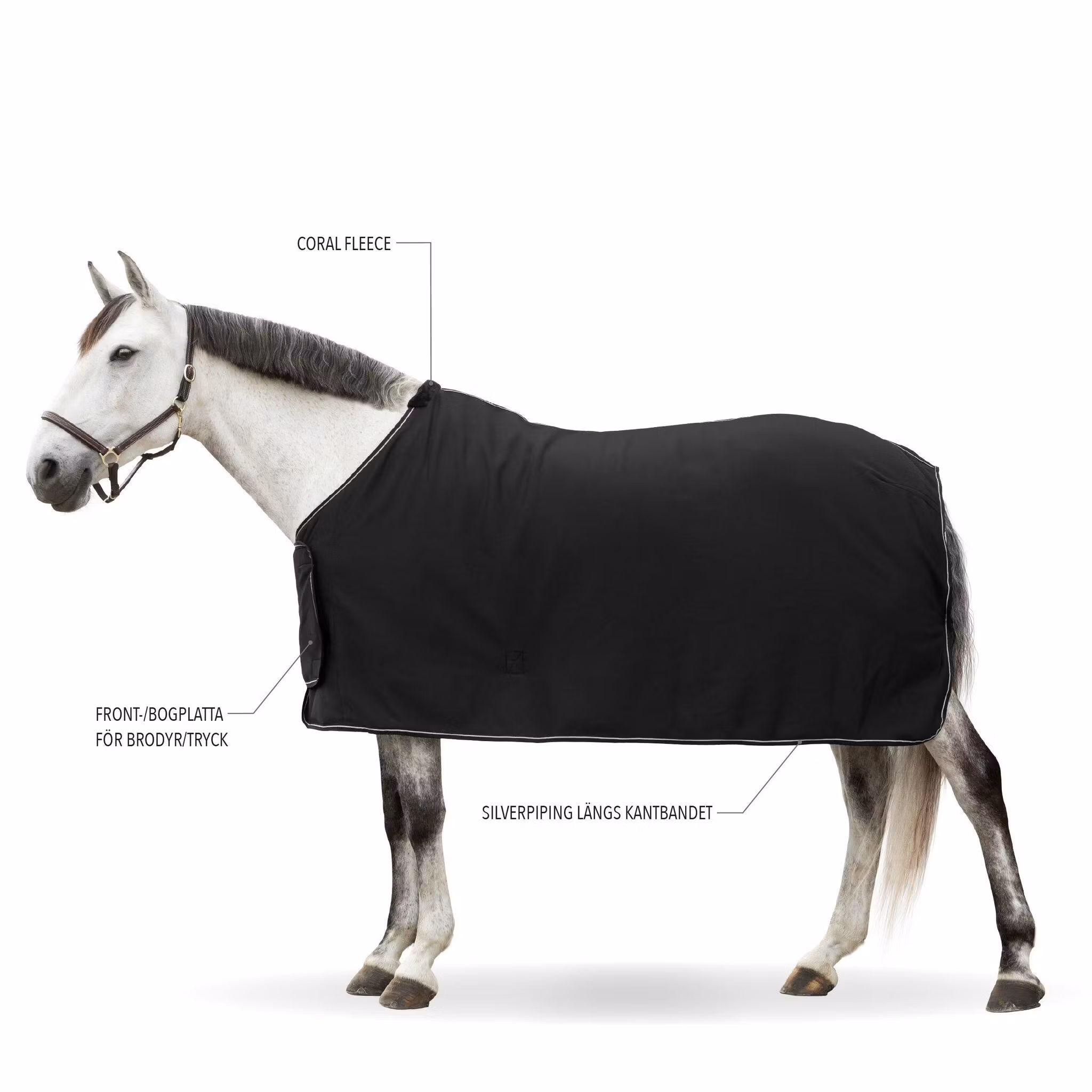 Ett stilrent och prisvärt tävlingstäcke tillverkat i mjuk och absorberande jerseyfleece som ger både komfort och funktion efter träning eller tävling. Täcket har dubbla bogspännen som döljs av en elegant front-/bogplatta – perfekt för brodyr med namn eller logotyp. Utrustat med en dold, avtagbar maggjord som håller täcket på plats. Fodrad med coral fleece vid manken som fördelar trycket och minimerar skav. Snygg silverpiping längs kantbandet. Storlek: 115, 125, 135, 145, 155, 165 cm