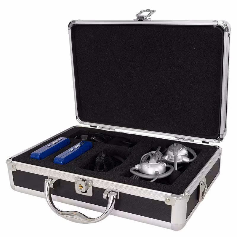 Ett set innehåller: En tränar- och en elevenhet, fyra hörsnäckor med sladd, laddkabel samt en en fin förvaringsväska.