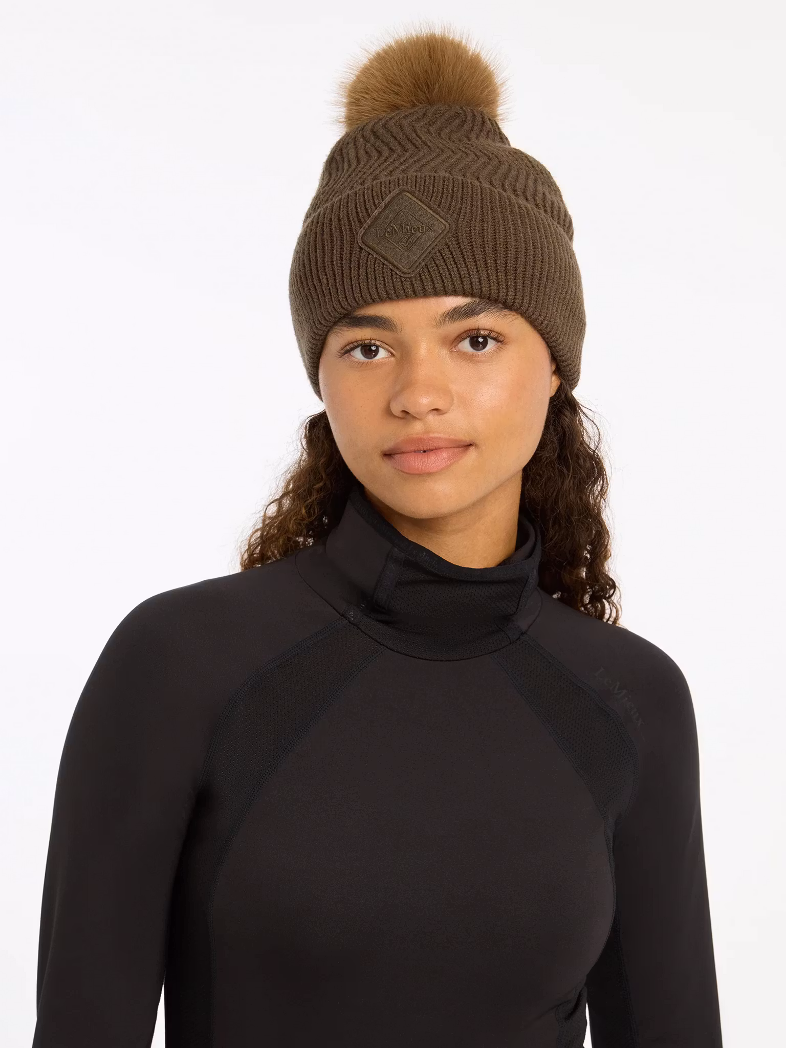 Håll dig varm i kallt väder med denna snygga mössa från LeMieux. Ett mjukt, fint chevronmönster med ribbad fåll och ett varmt foder i fuskpäls håller kyla och d