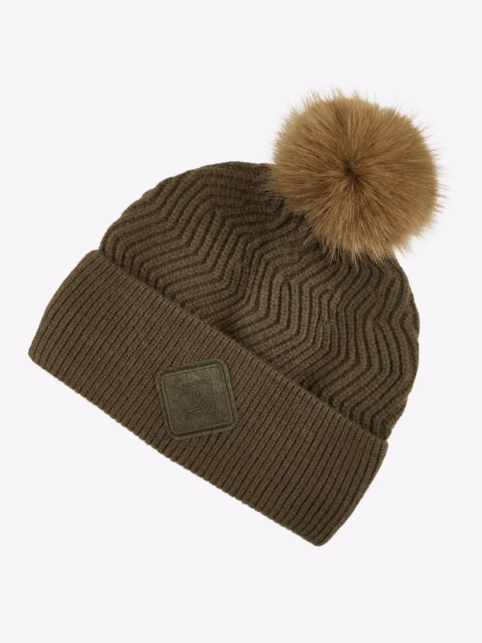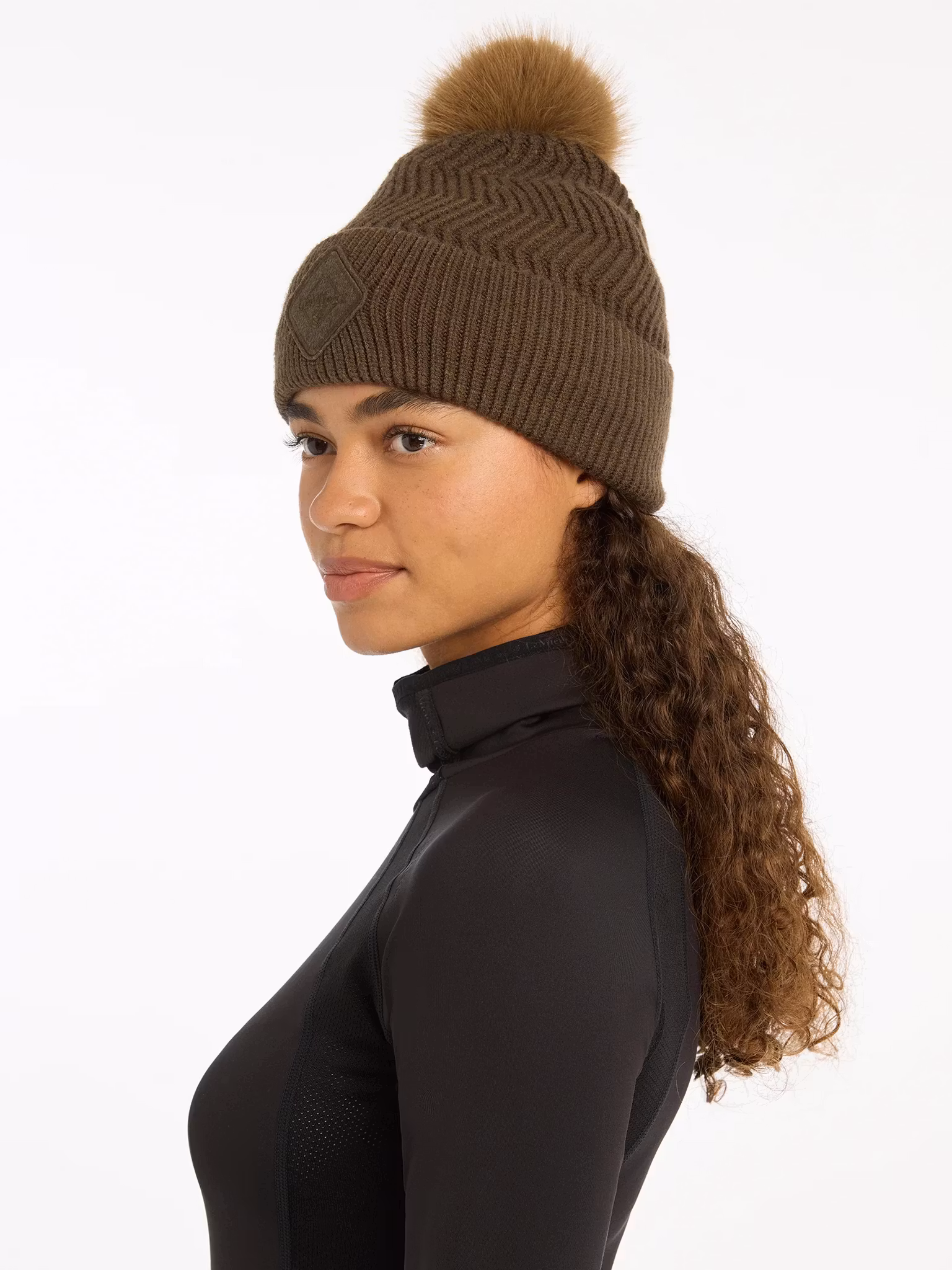 • Mjukt, fint chevronmönster med ribbad fåll • Avtagbar tofs • Varmt foder i fuskpäls • Broderad LeMieux-logotyp
