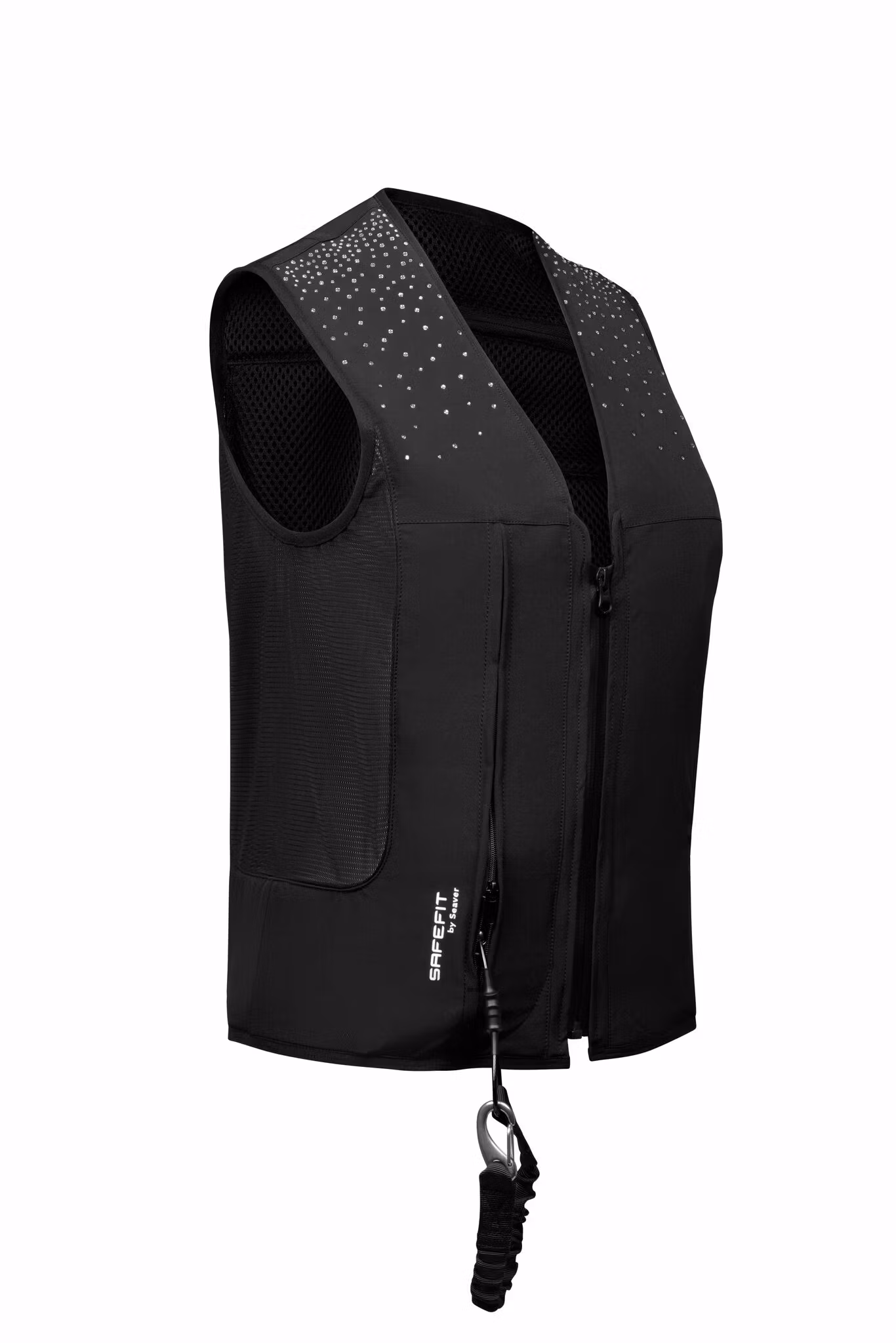 Svart Airbag väst med glittrande Swarovski-kristaller. Godkänd enligt standard NF S72- 800-2021. SAFEFIT airbag ridväst är både lätt och smidig att ha på sig samtidigt som den ger dig full rörelsefrihet och bäst av allt, den skyddar dig om olyckan är framme och du ramlar av din häst eller ponny.