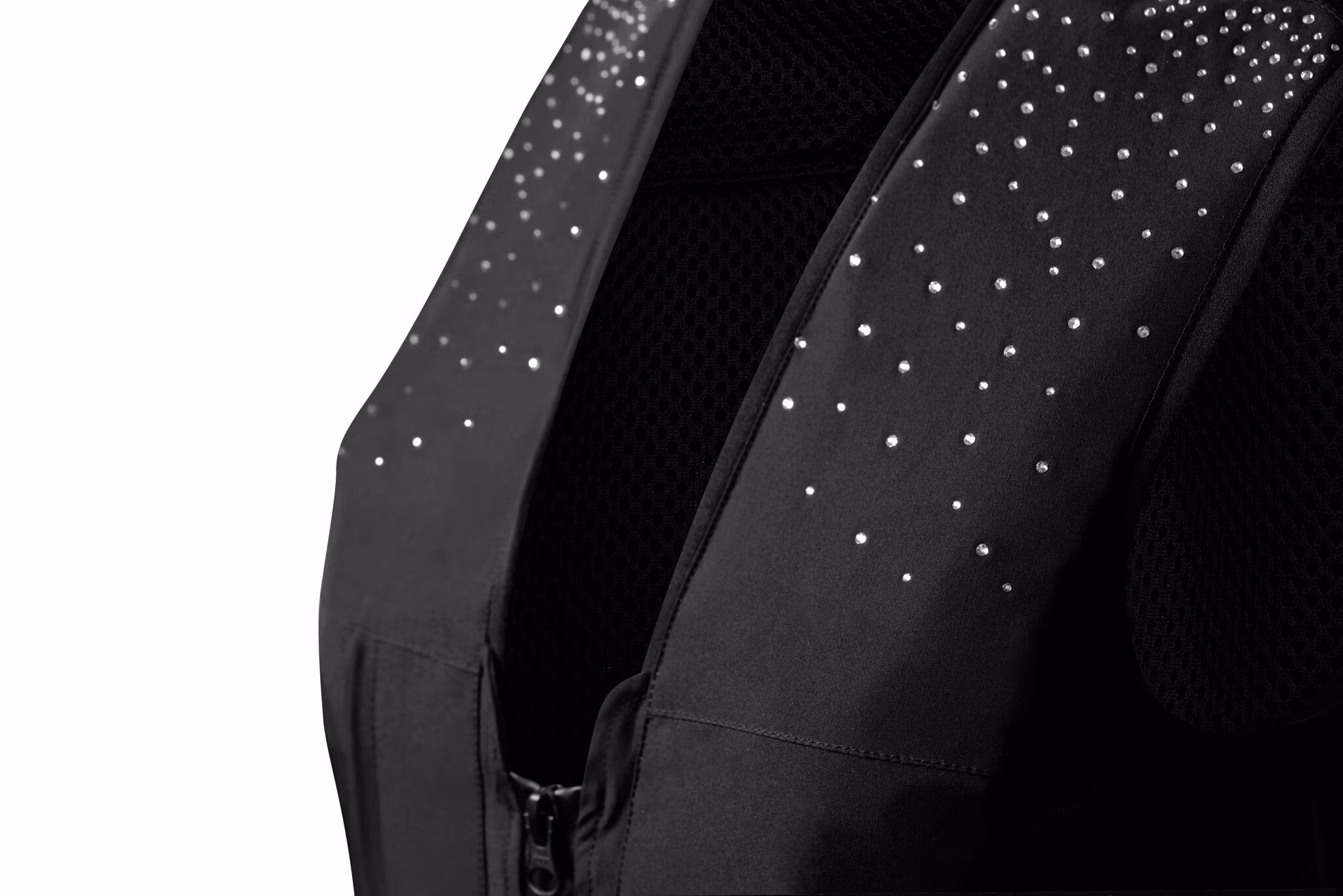 Svart Airbag väst med glittrande Swarovski-kristaller. Godkänd enligt standard NF S72- 800-2021. SAFEFIT airbag ridväst är både lätt och smidig att ha på sig sa