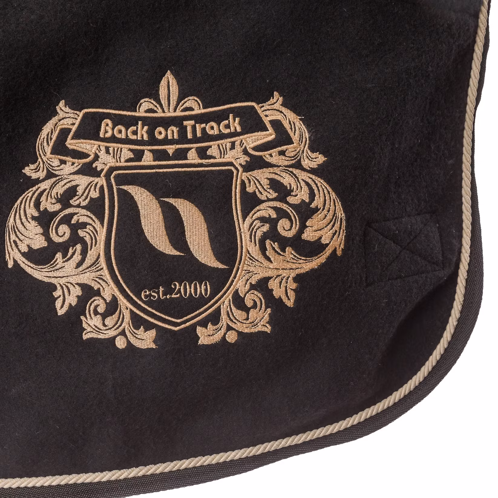 Elegant champagnefärgad passpoal längs med hela täcket och en broderad logo på sidan. Skrittäcket fästs enkelt och säkert med kardborrspänne vid manken, och kan kan bäras under eller över sadelkåpan.