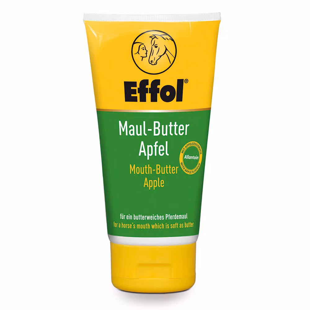 Hästen accepterar bettet bättre då salvan har äppelsmak och skapar en bättre miljö i hästens mun. Smörj rikligt med Effols Mouth Butter i hästens mungipor både före och efter ridning. 150ml.