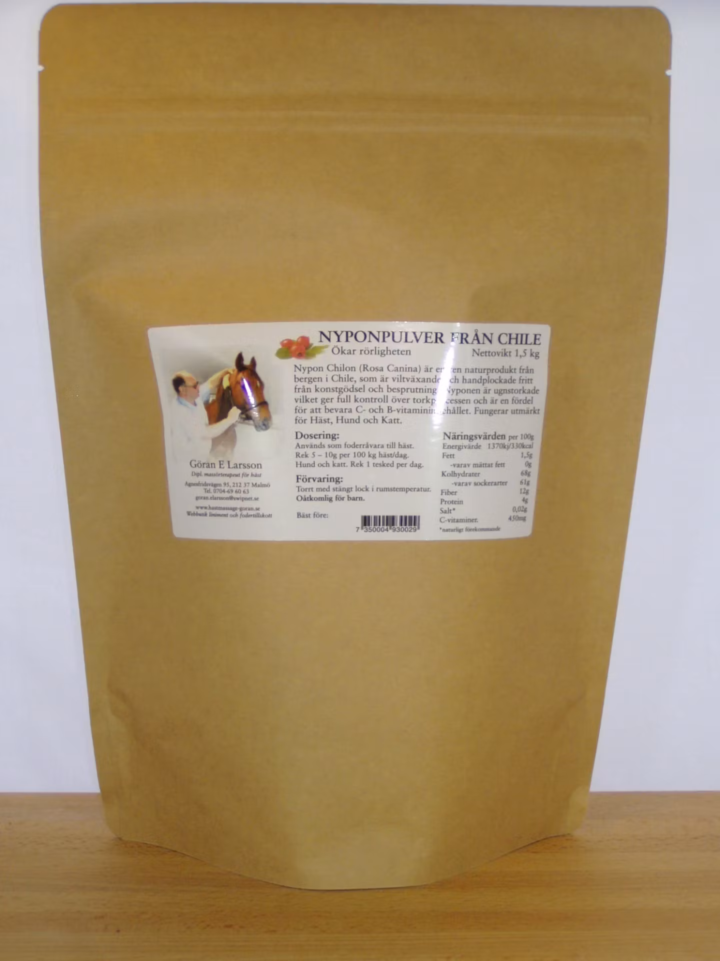 Nypon Chilon (Rosa Canina) är en naturprodukt från bergen i Chile, som är viltväxande och handplockade fritt från konstgödsel och besprutning. Nyponen är ugnstorkade som ger full kontroll över torkprocessen och är en fördel för att bevara C- och B vitamininnehållet. Anses hjälpa mot ledbesvär och nedsatt rörlighet. Nyponpulver är att betrakta som fodertillskott till djur. Innehåller inga tillsatser eller konserveringsmedel. Går bra att blötlägga, men får aldrig värmas upp