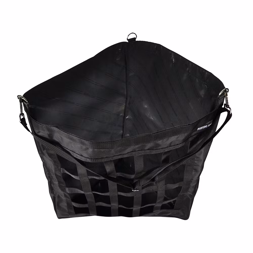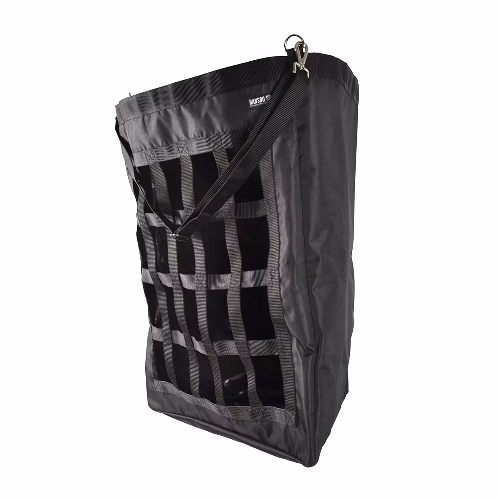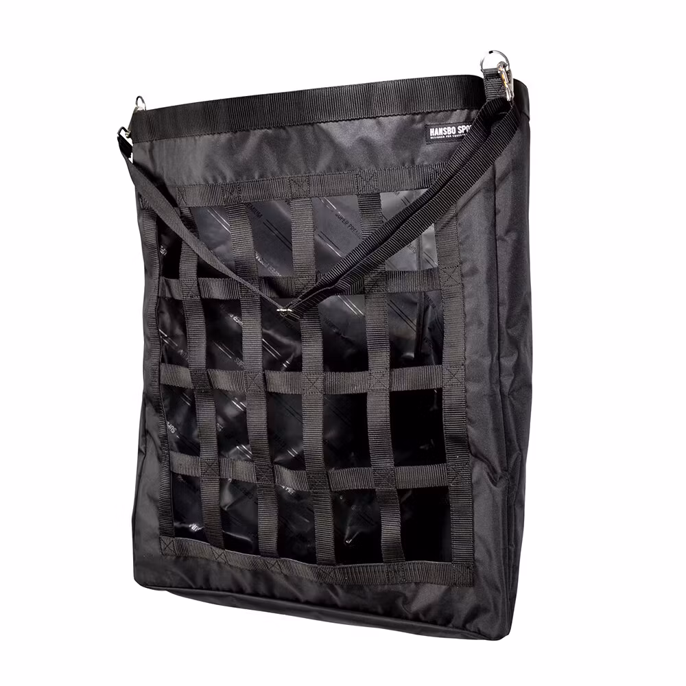 Trekantig höpåse/ hösäck med slowfeed (9 x 6 cm) framsida för upphängning i hörn. Lämpar sig både i boxen och transporten. Designad med D-ringar för upphängning