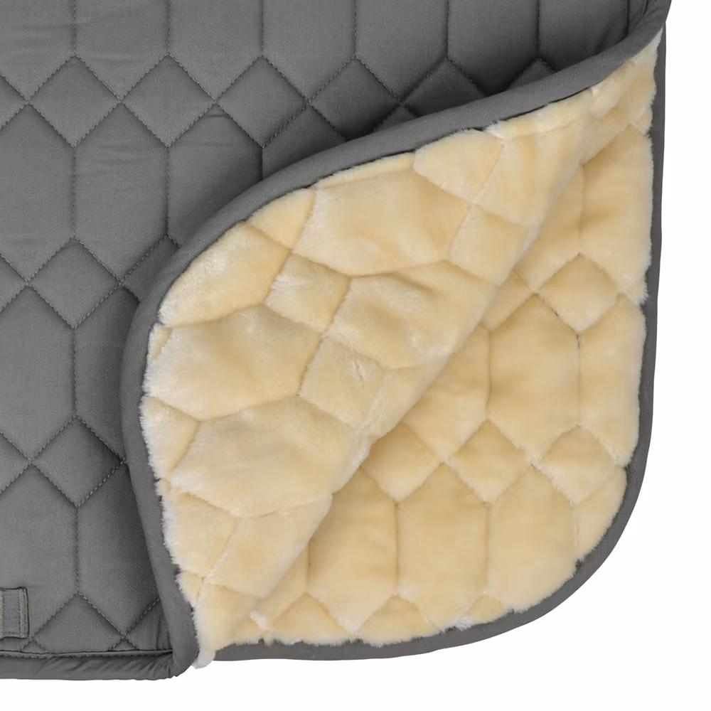 Schabrak med mysig insida i syntetiskt fårskinn. Perfekt under fällningssäsongen, och till känsliga hästar som lätt får skav. Exatron-mönster, Hansbo Sport logga vid sadelgjordsfästet och vid manken. Perfekt för egen brodyr. Storlek Full.
