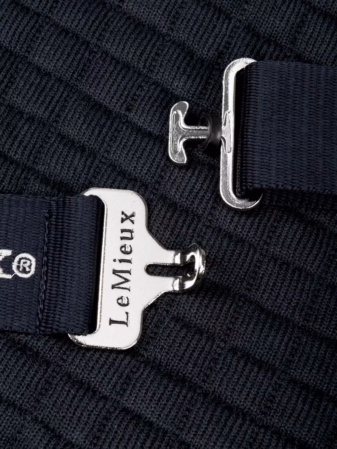 Täcket stängs framtill med dubbla, justerbara T-spännen med eleganta LeMieux-jacquarddetaljer. Justerbara, korsade gjordstroppar bidrar till den nära passformen och maximerar täckets fukttransporterande effekt.