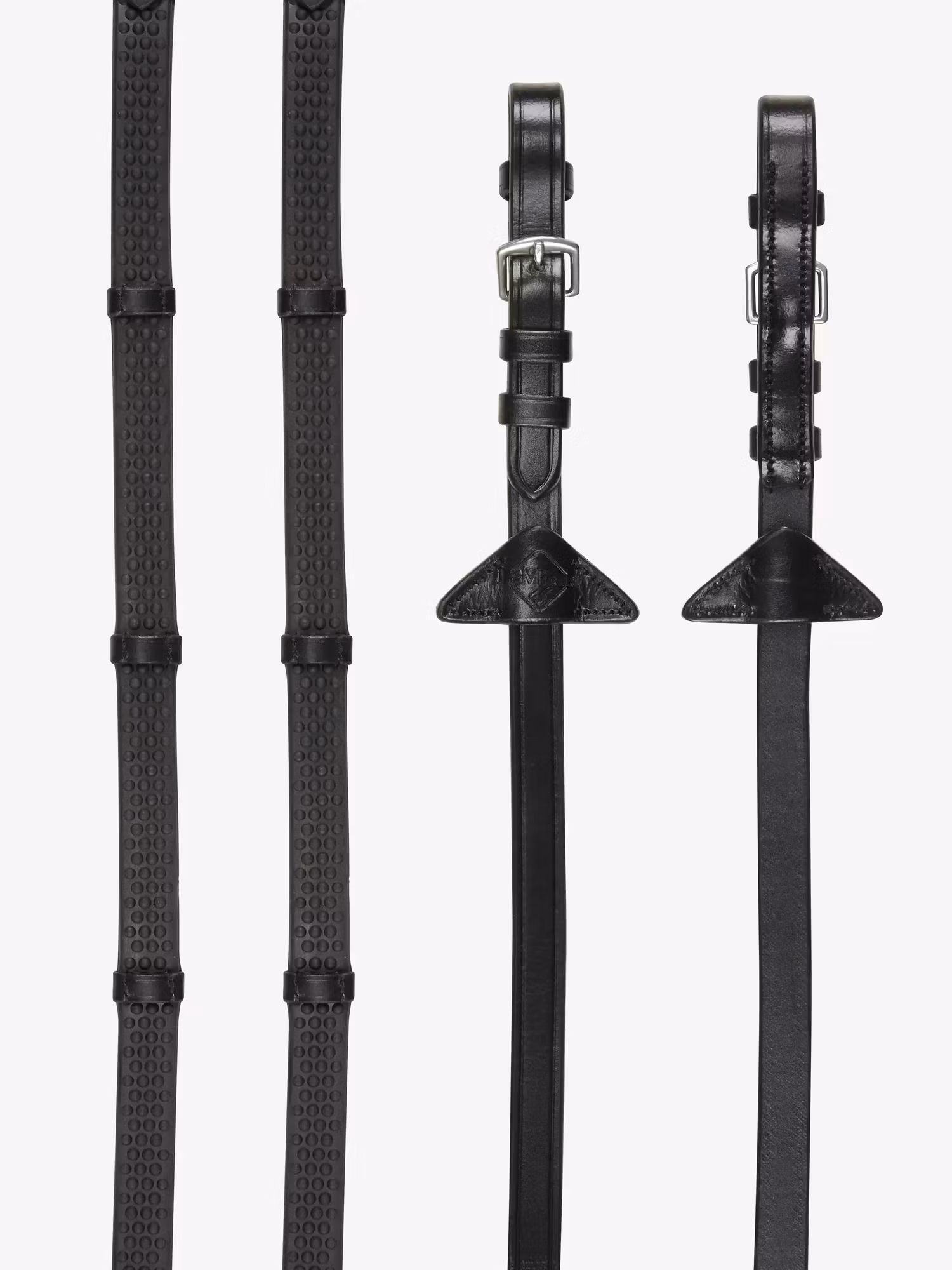 Dessa tyglar är tillverkade av mjukt och flexibelt gummi, vilket gör dem bekväma att rida och enkla att hantera. De är lätta i ryttarens händer, och den inre nylonstrukturen förhindrar att de töjs ut med tiden. De insydda läderstopparna ger extra grepp och är optimalt placerade för smidig och stabil kontakt.