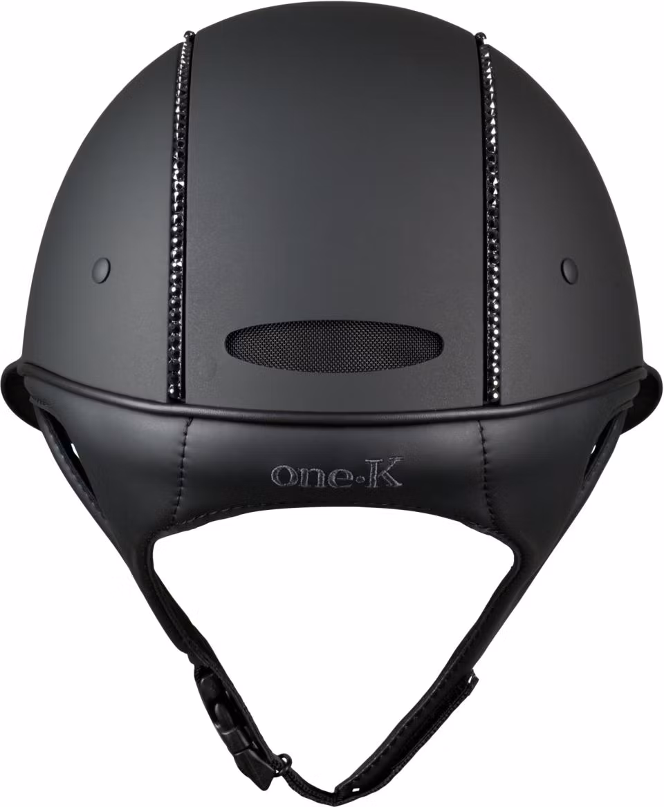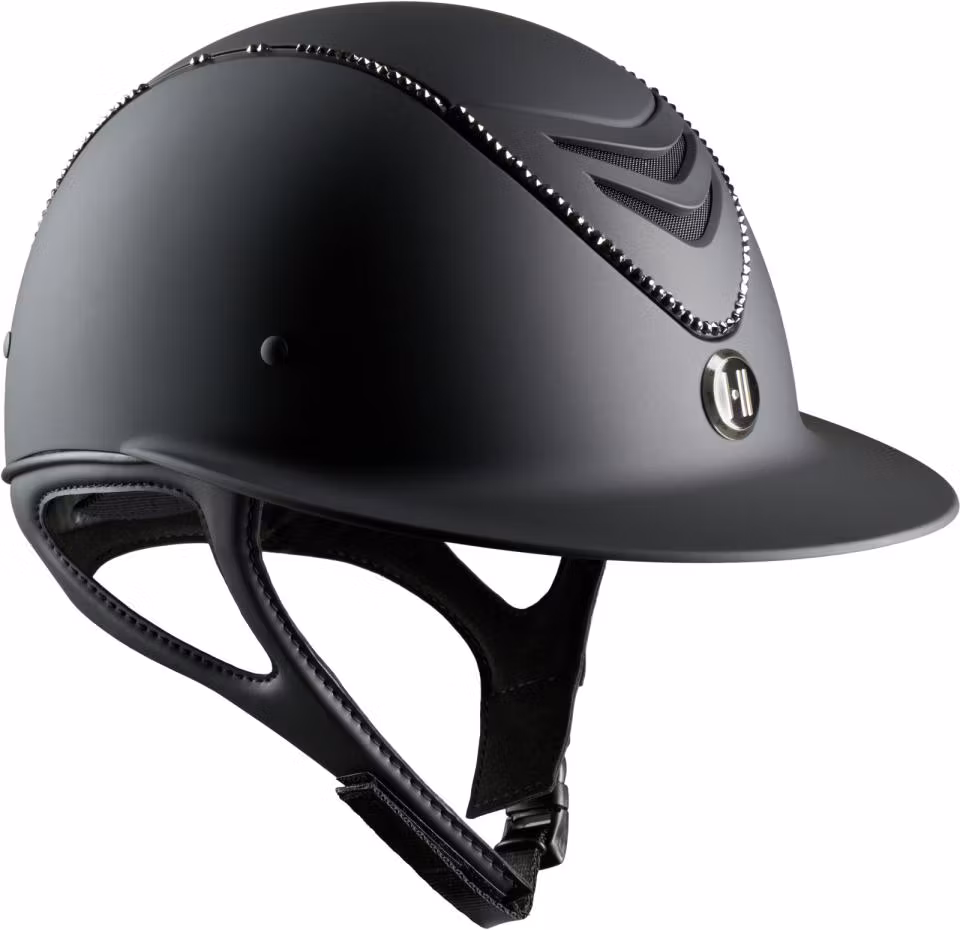Superlyxig svart, mattsvart ridhjälm med bred solskärm. Swarowski-piping. OBS! Liner måste köpas till för att säkerställa korrekt passform.OneK ridhjälmen kombi