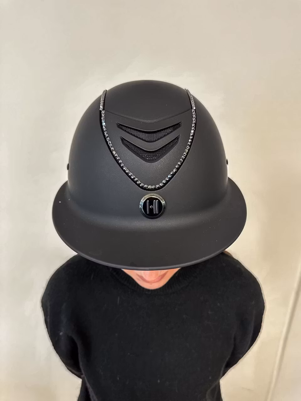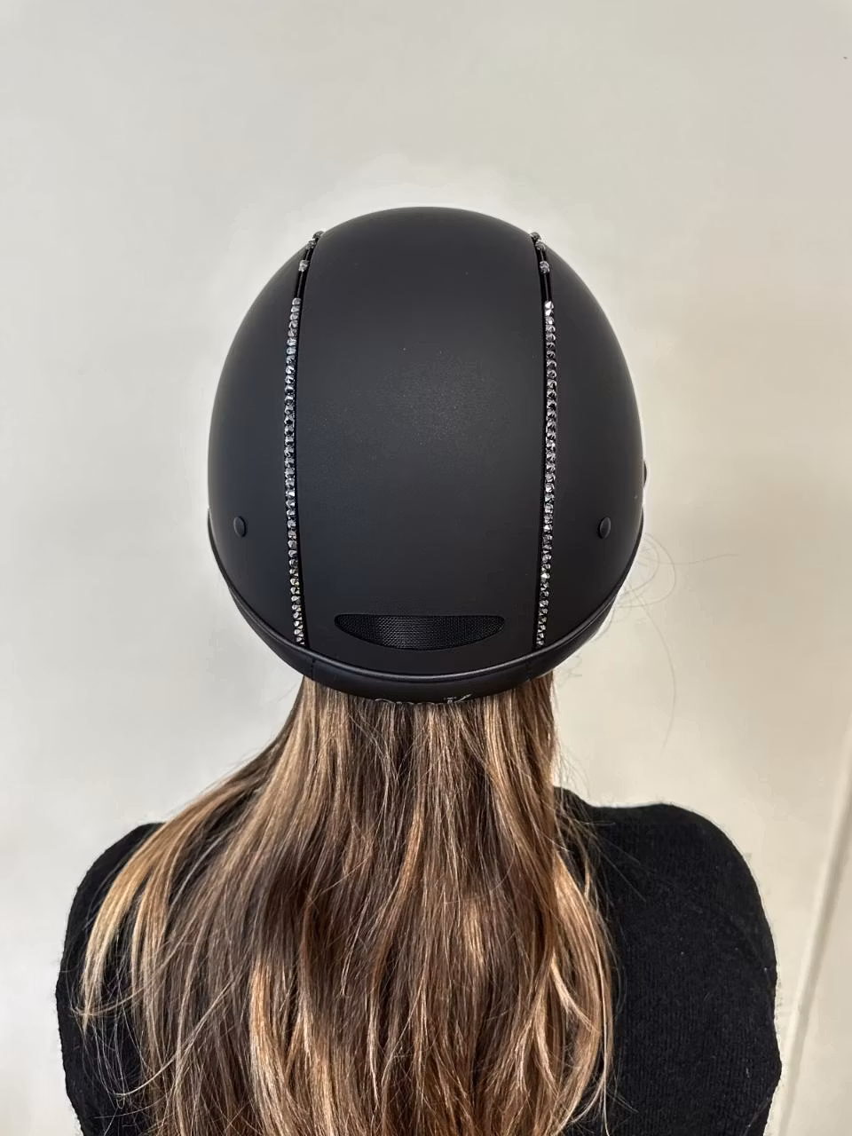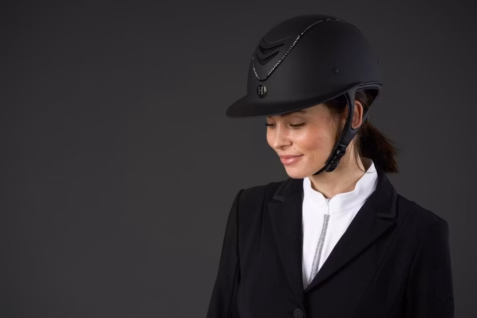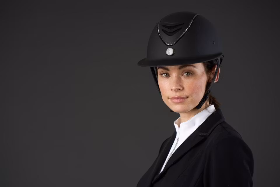 Superlyxig svart, mattsvart ridhjälm med bred solskärm. Swarowski-piping. OBS! Liner måste köpas till för att säkerställa korrekt passform.