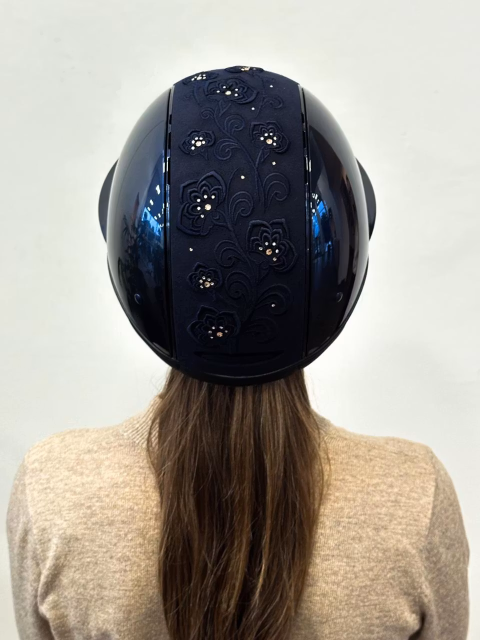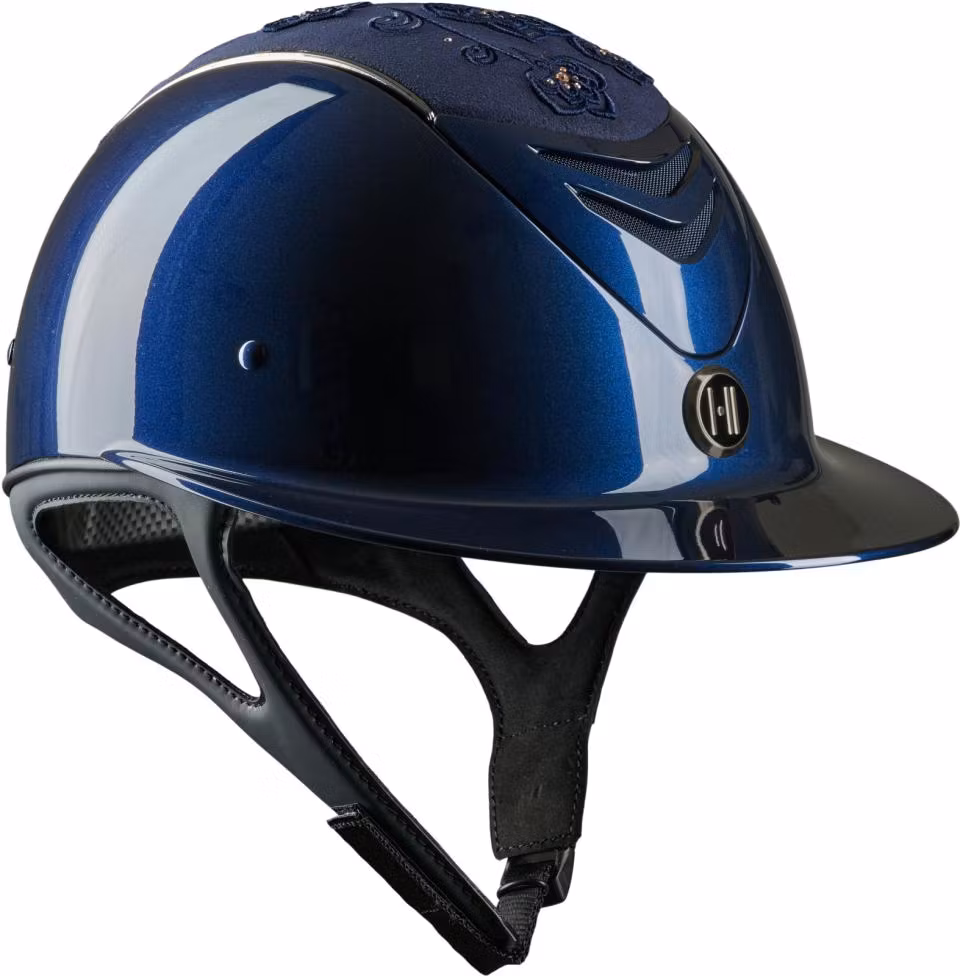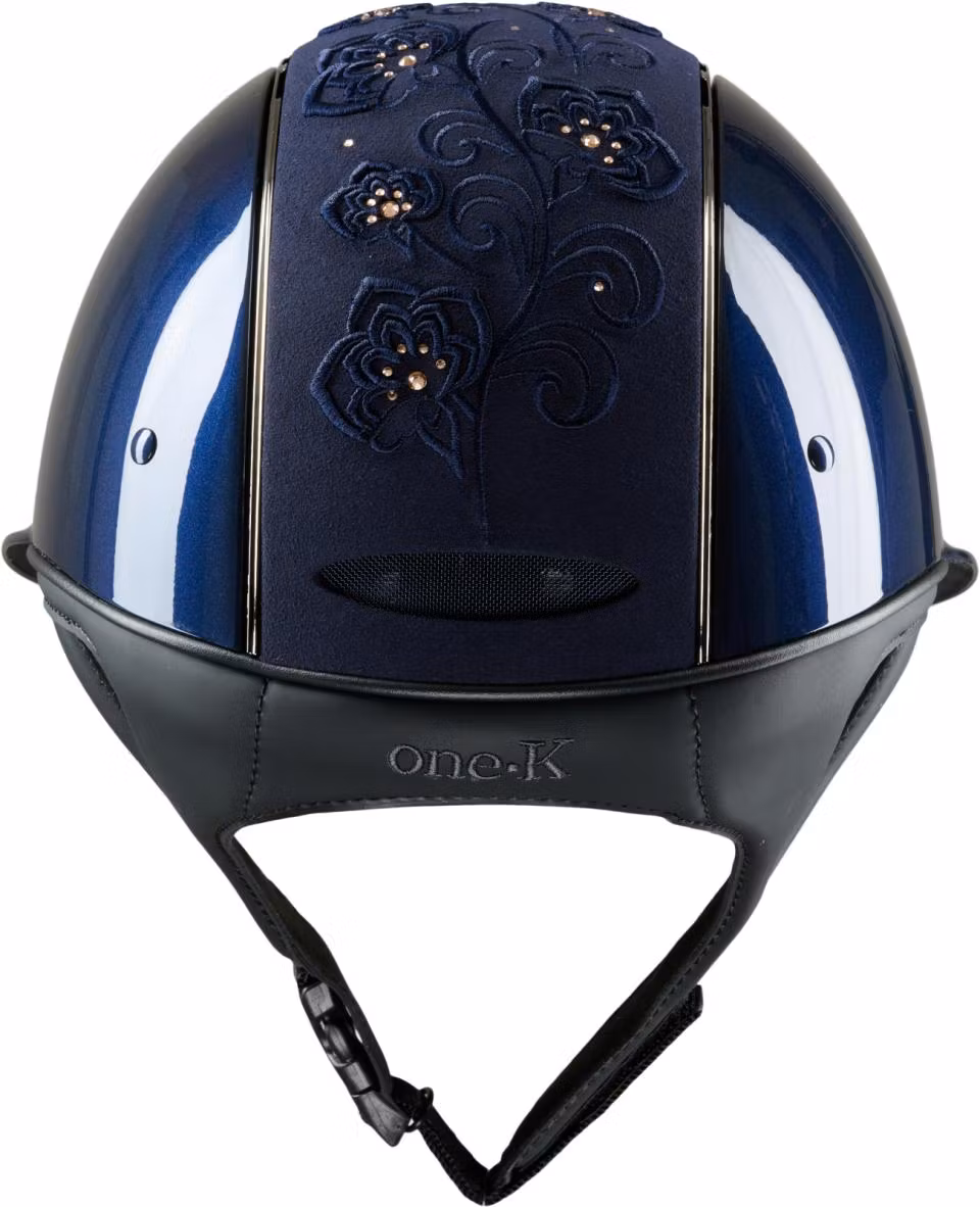 Blå, glossy ridhjälm med bred skärm. Broderad topp med kromdetaljer. OBS! Liner måste köpas till för att säkerställa korrekt passform.OneK ridhjälmen kombinerar