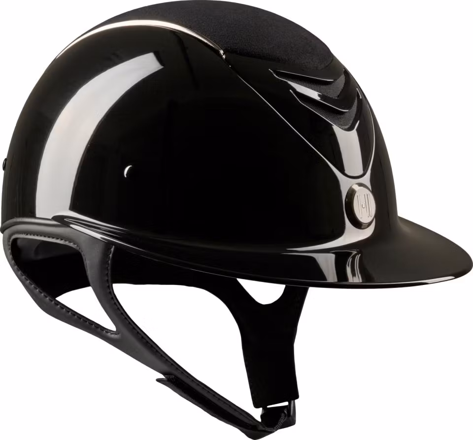 Svart, glossy ridhjälm med bred skärm. Topp i chamude, mockaliknande material med kromdetaljer. OBS! Liner måste köpas till för att säkerställa korrekt passform