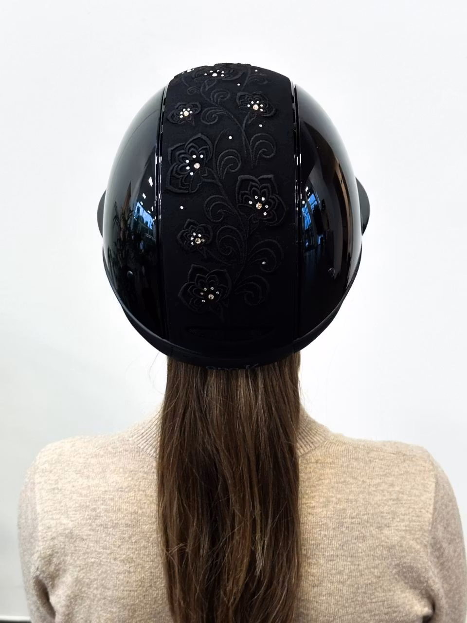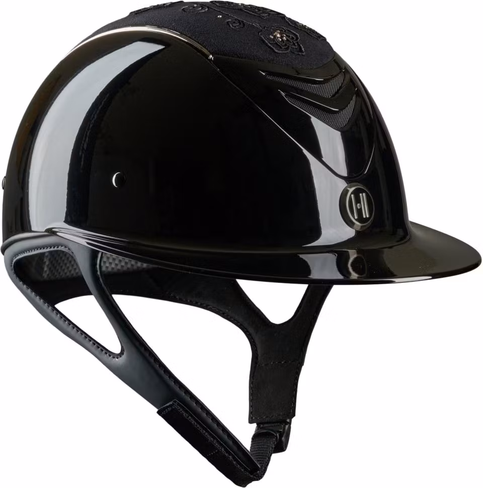 Svart, glossy ridhjälm med bred skärm. Broderad topp med kromdetaljer. OBS! Liner måste köpas till för att säkerställa korrekt passform.OneK ridhjälmen kombiner