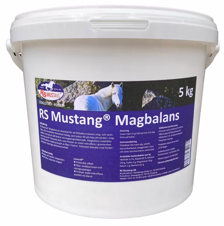 RS Mustang® Magbalans är utvecklad för att förbättra hästens mag- och tarmhälsa. Den innehåller förkalkad rödalg, som bidrar till att höja pH-värdet i magsäcken